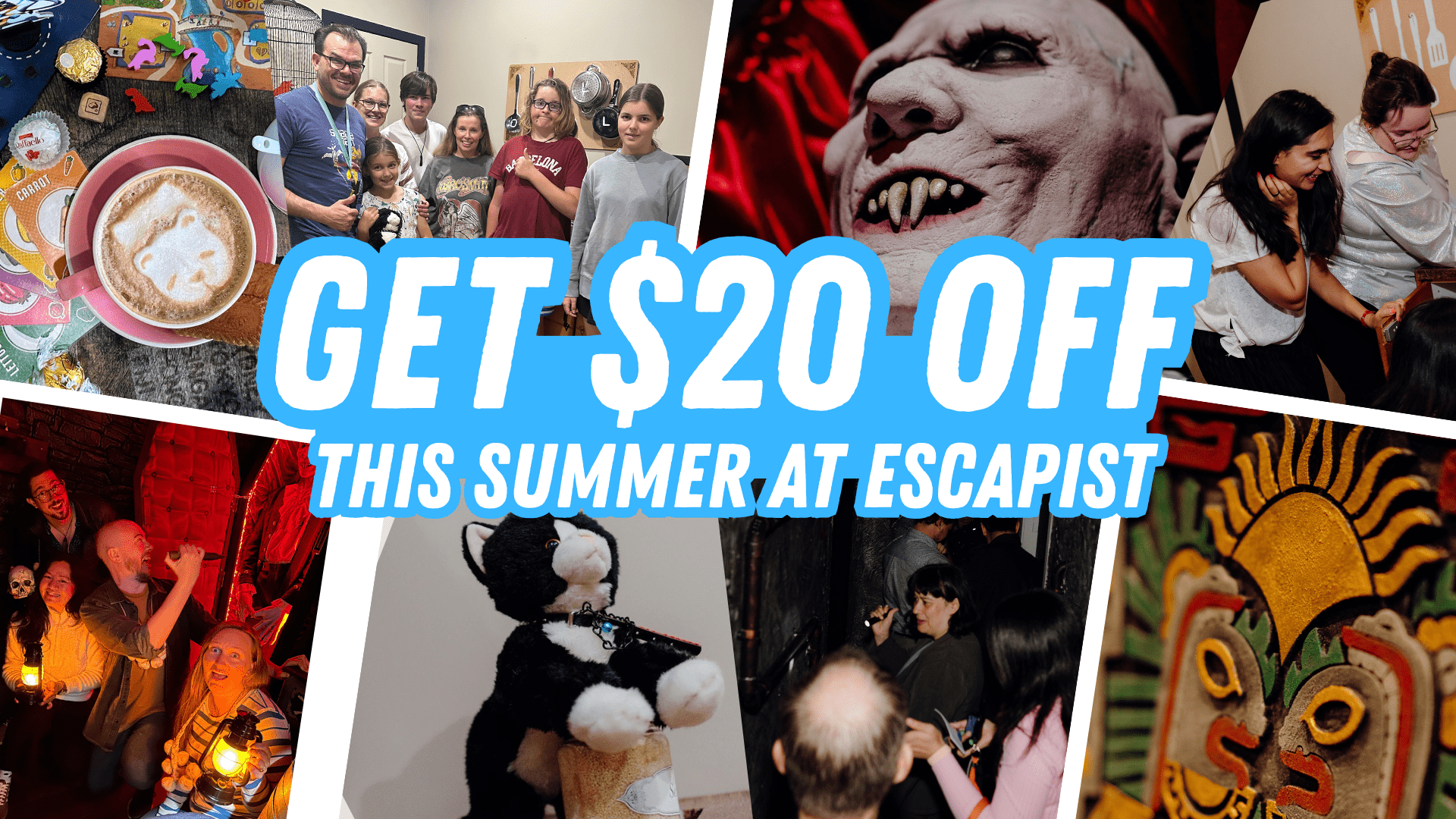 Need to get out of the heat? Come on in and escape with us! We have 5 fun and fabulous rooms to choose from, and the AC is pumping all summer long. If that's not enough to cool you down, we also have cold drinks and desserts available in our board game café!