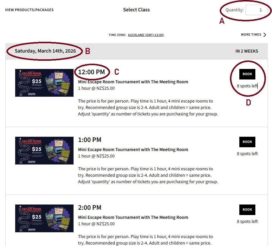 Lastly, book your tickets (D). The available number of spots will show just under the 'BOOK' button.