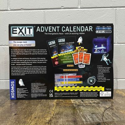 The Exit Advent calendar is a big escape room in a box type game where you solve 24-mini riddles or puzzles, each puzzles should take around 10-15 minutes to solve. These puzzles will build into the whole story of Intergalactic Race.