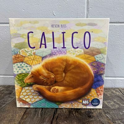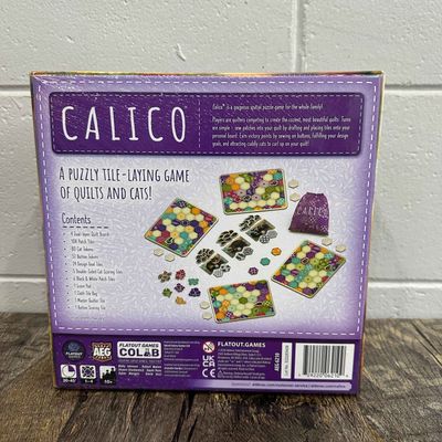 In Calico, players are quilters competing to create the coziest, most beautiful quilts. Turns are simple: sew patches to your quilt by drafting and placing tiles into your board. Earn victory points by sewing on buttons, fulfilling your design goals, and attracting cuddly cats to curl up on your quilt.